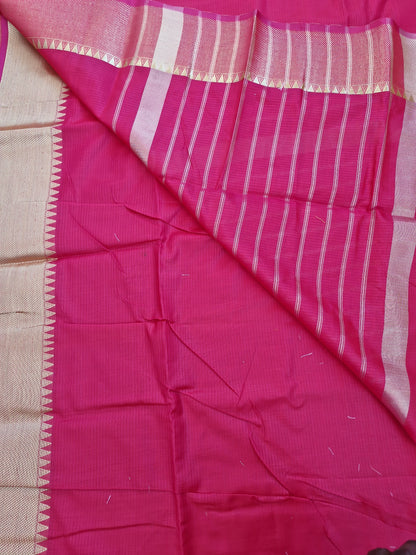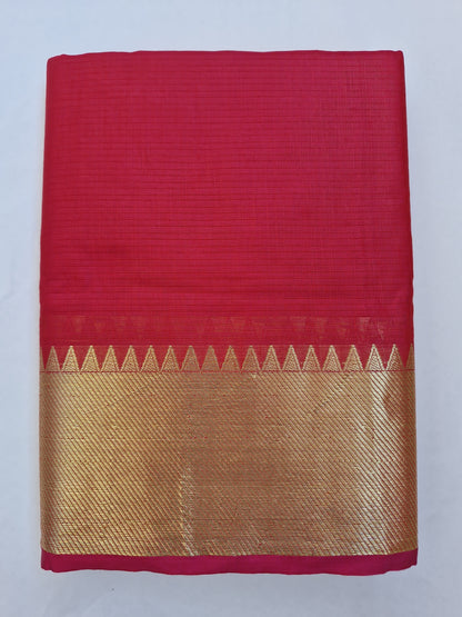 This elegant Mangalagiri cotton silk blend saree is a true blend of simplicity and tradition. Woven in a deep shade, the saree features a classic temple border in rich golden zari, giving it a striking and timeless appeal. The body is adorned with subtle golden stripes across the pallu, adding a graceful flow to the drape.
