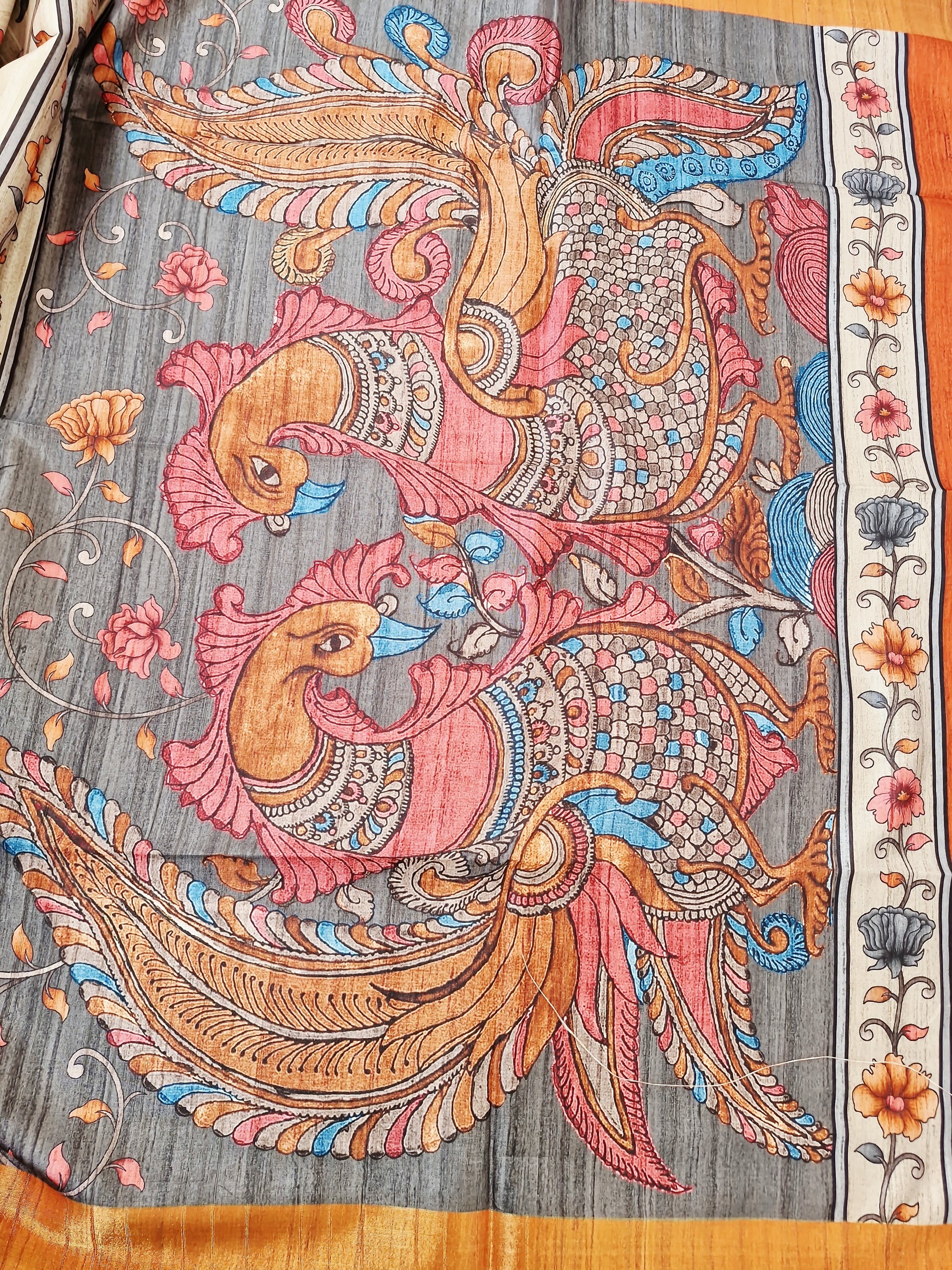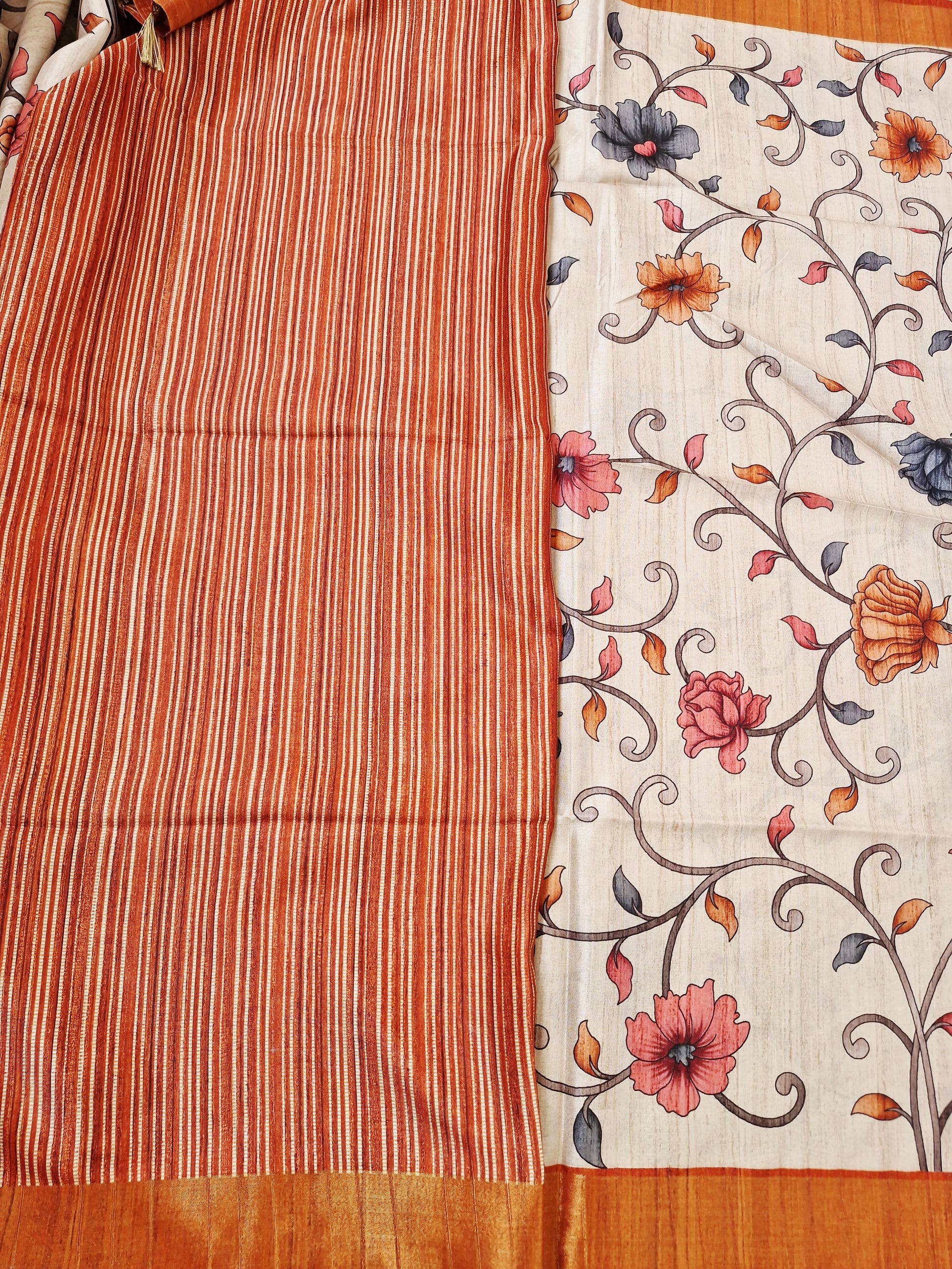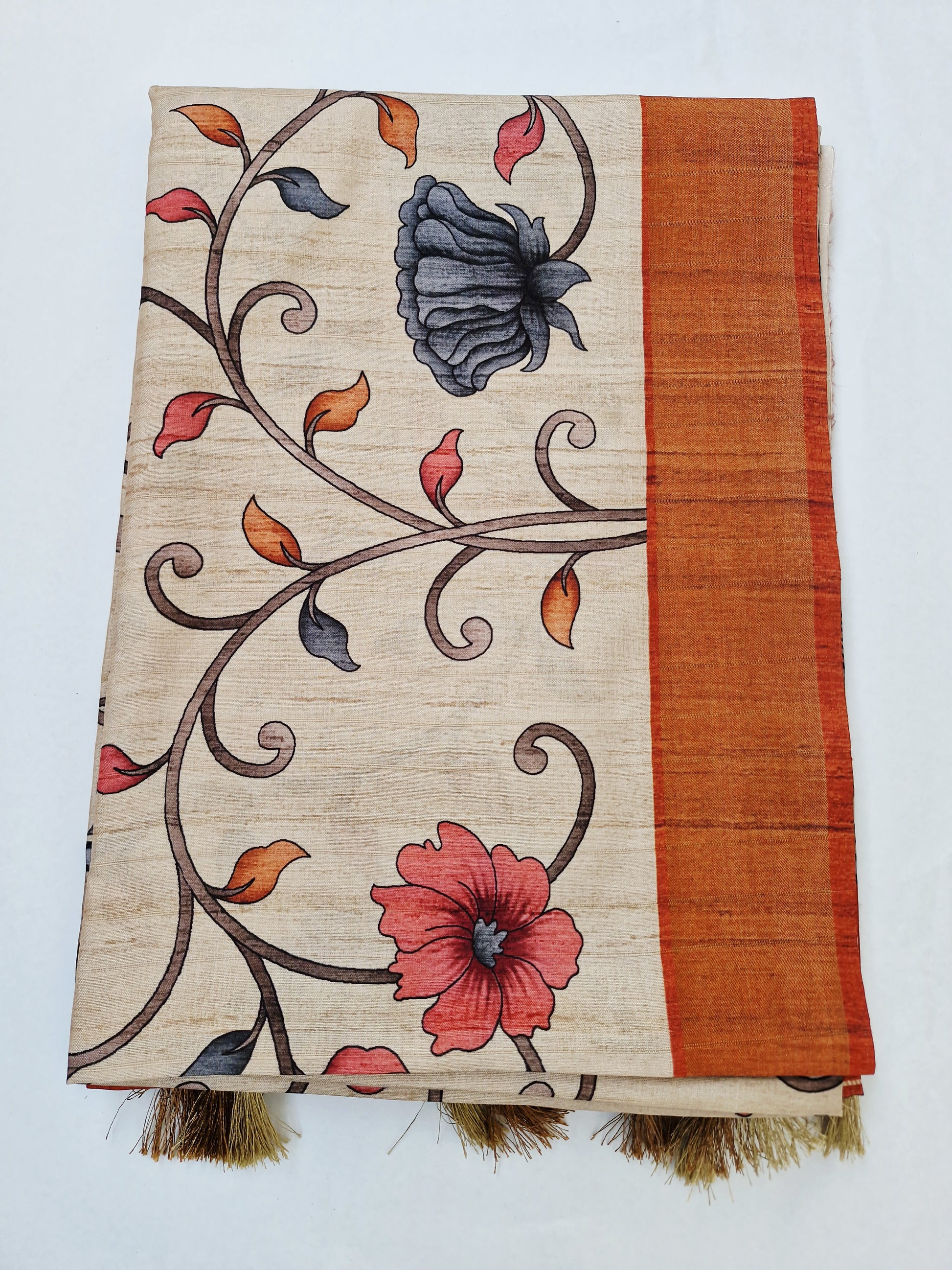 Bring home the charm of tradition and artistry with this stunning handprinted saree. The saree features a cream base with colorful floral motifs across the body, giving it a vibrant and graceful appeal. The contrasting striped pattern on one side adds a modern touch, balancing tradition with contemporary style.