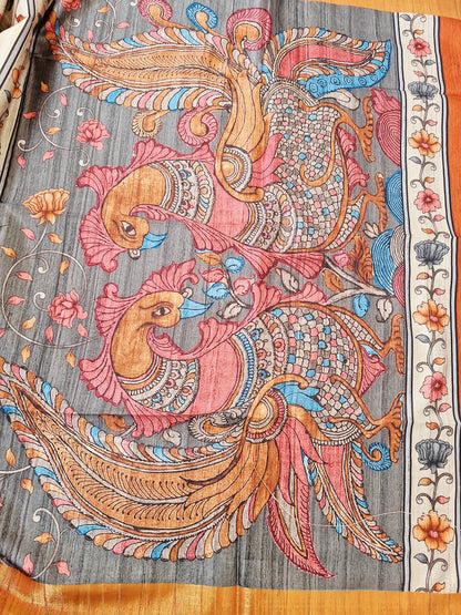 The highlight of this saree is its exquisite pallu, showcasing majestic handpainted peacocks in shades of blue, pink, and green, surrounded by floral detailing—an elegant representation of Indian craftsmanship. Finished with a fabulous border and playful tassels, this saree is a true statement piece.