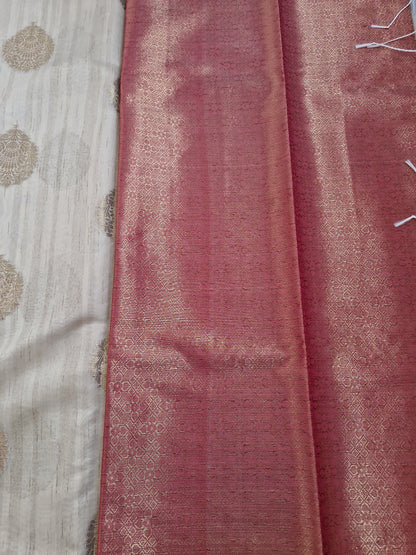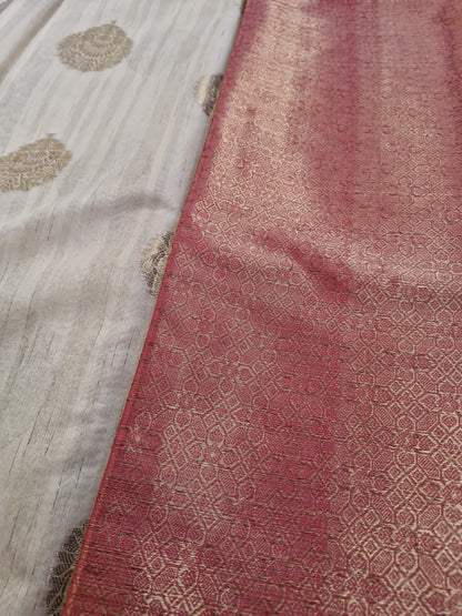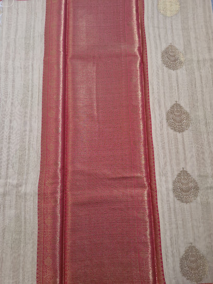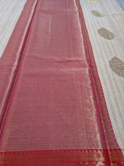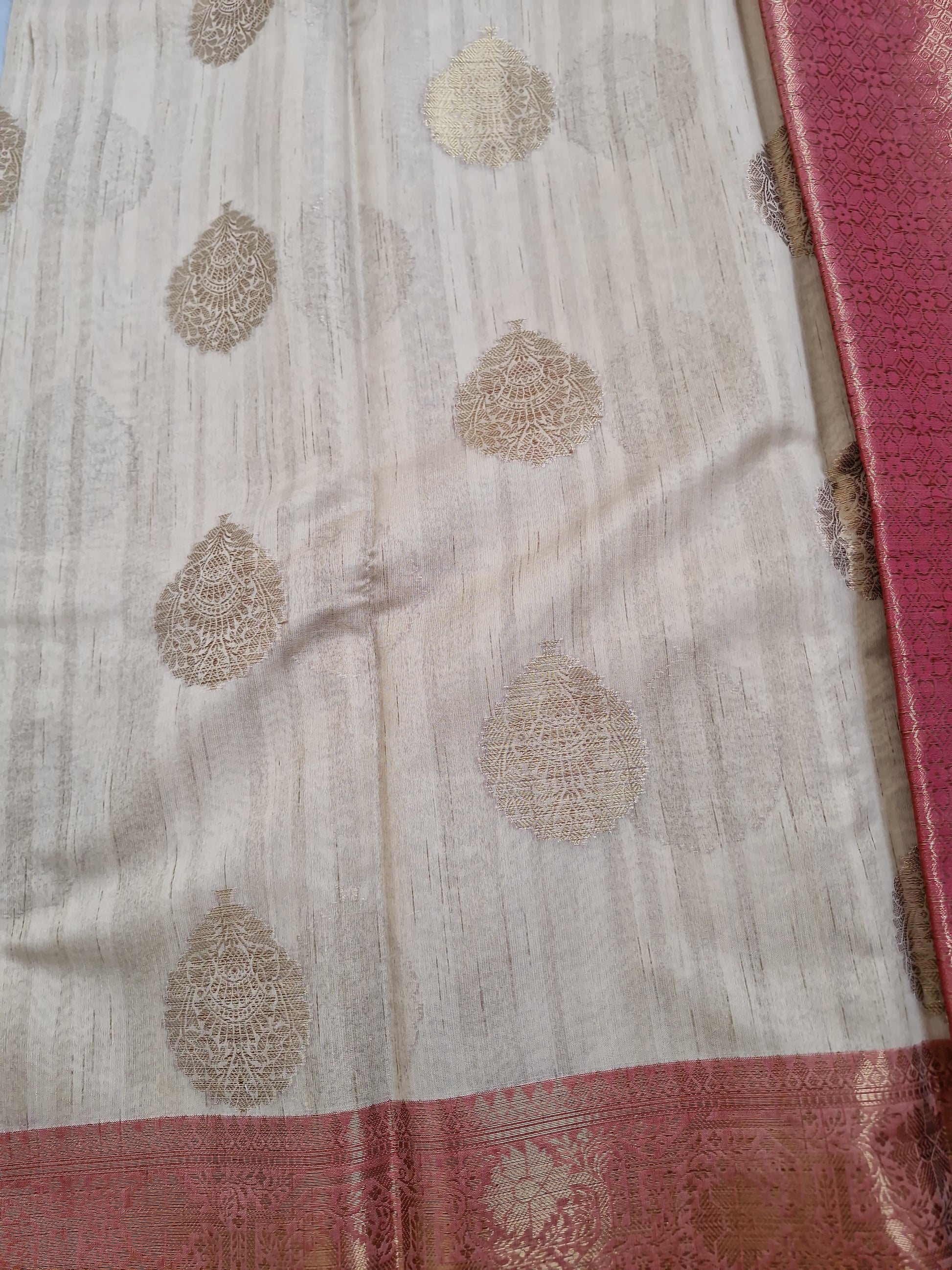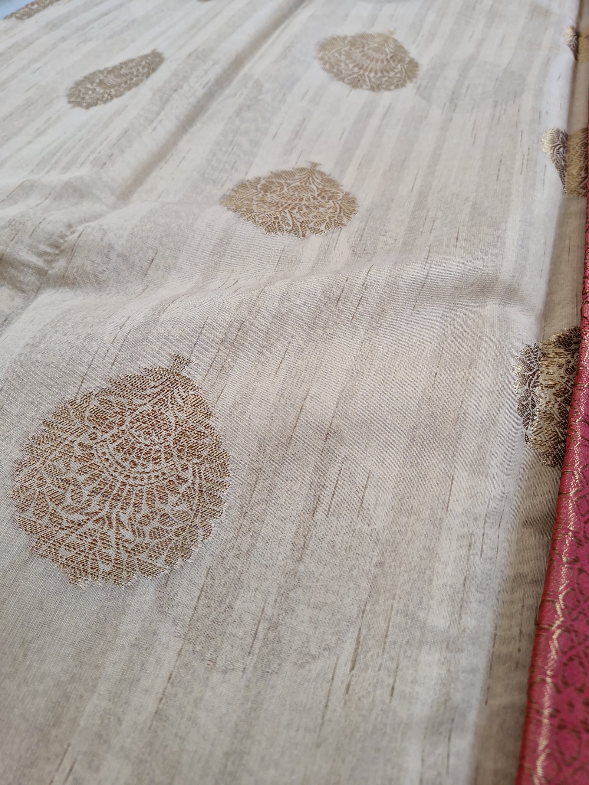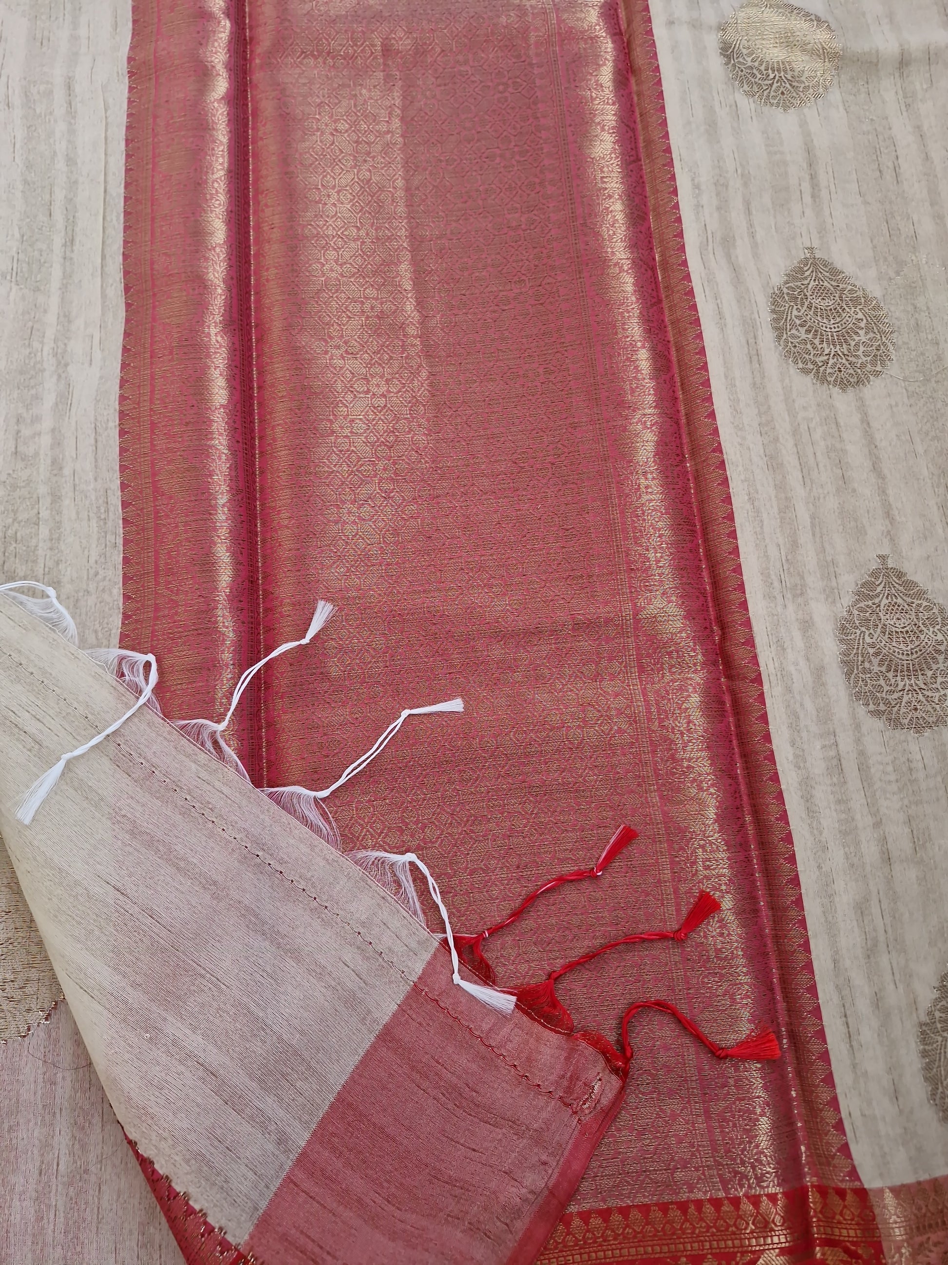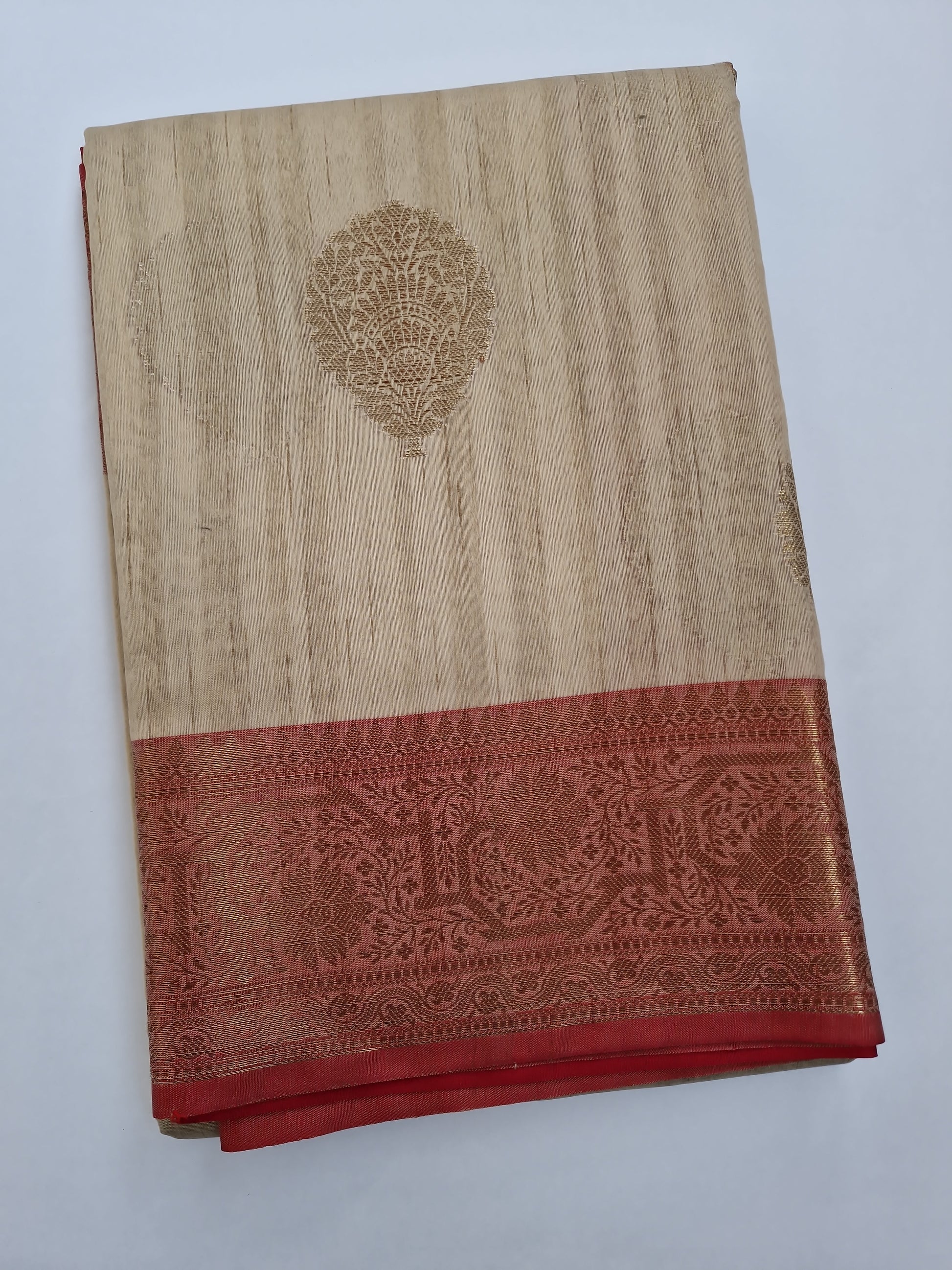 Step into timeless elegance with this luxurious Tussar Silk Saree. It is beautifully adorned with intricate woven motifs that reflect the richness of handloom tradition. The saree is complemented by a contrasting deep red border and pallu, intricately detailed with zari weaving in floral and geometric patterns, adding grandeur to its classic look.