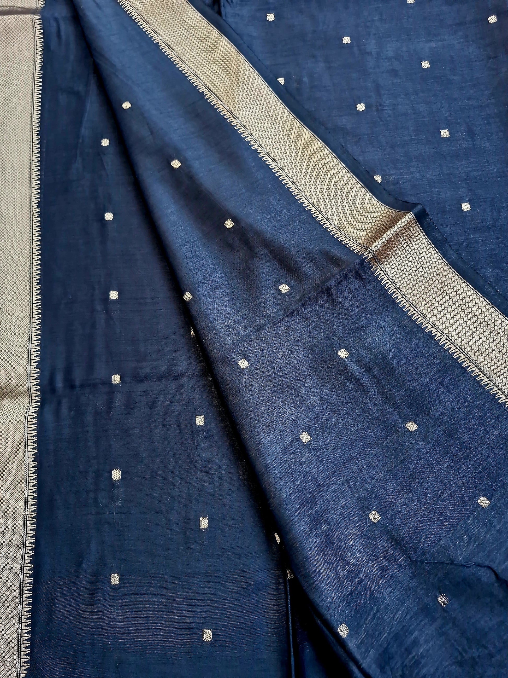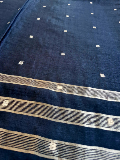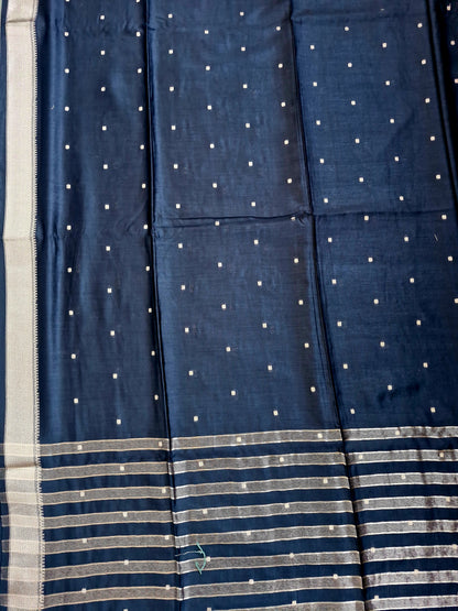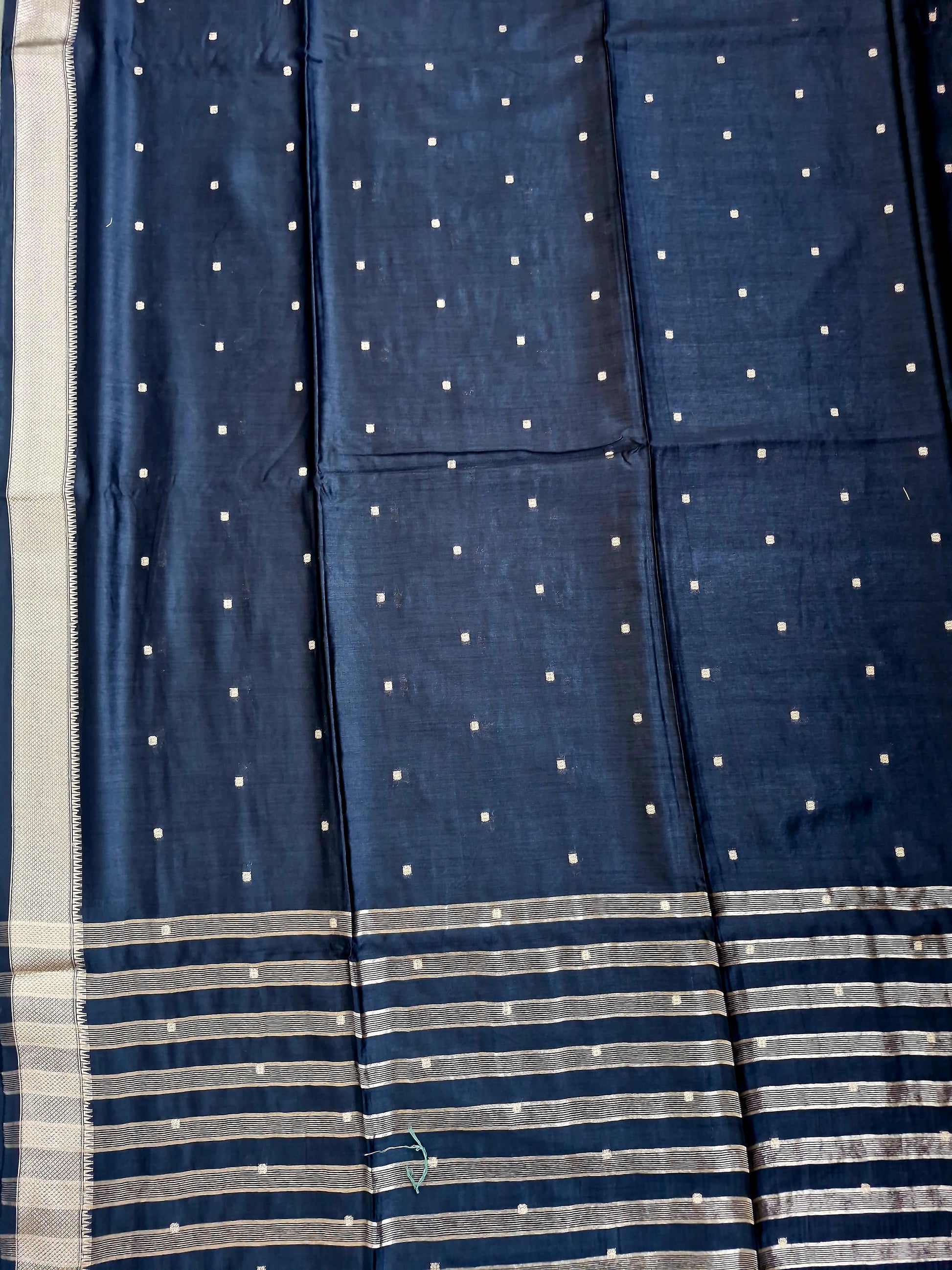 - Design: Minimal woven buttas with contrast zari border & striped pallu