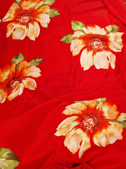 Step into elegance with this vibrant chiffon saree, crafted from soft, lightweight fabric that drapes effortlessly. The saree is adorned with large floral prints in warm tones of orange, yellow, and cream with green leaves, creating a bold yet graceful look. Its breezy chiffon texture ensures comfort while maintaining a chic and stylish appeal, perfect for both casual outings and special occasions.