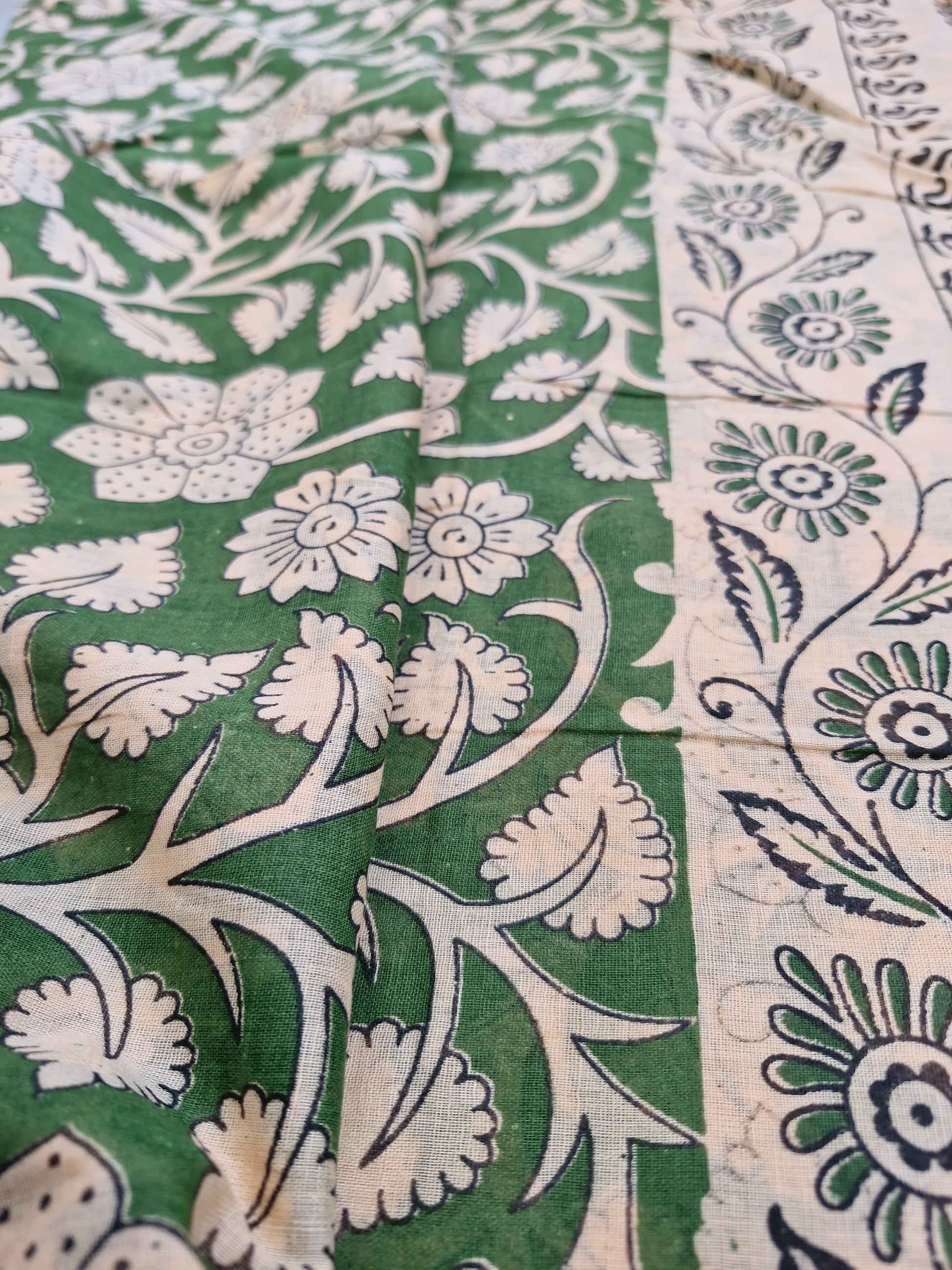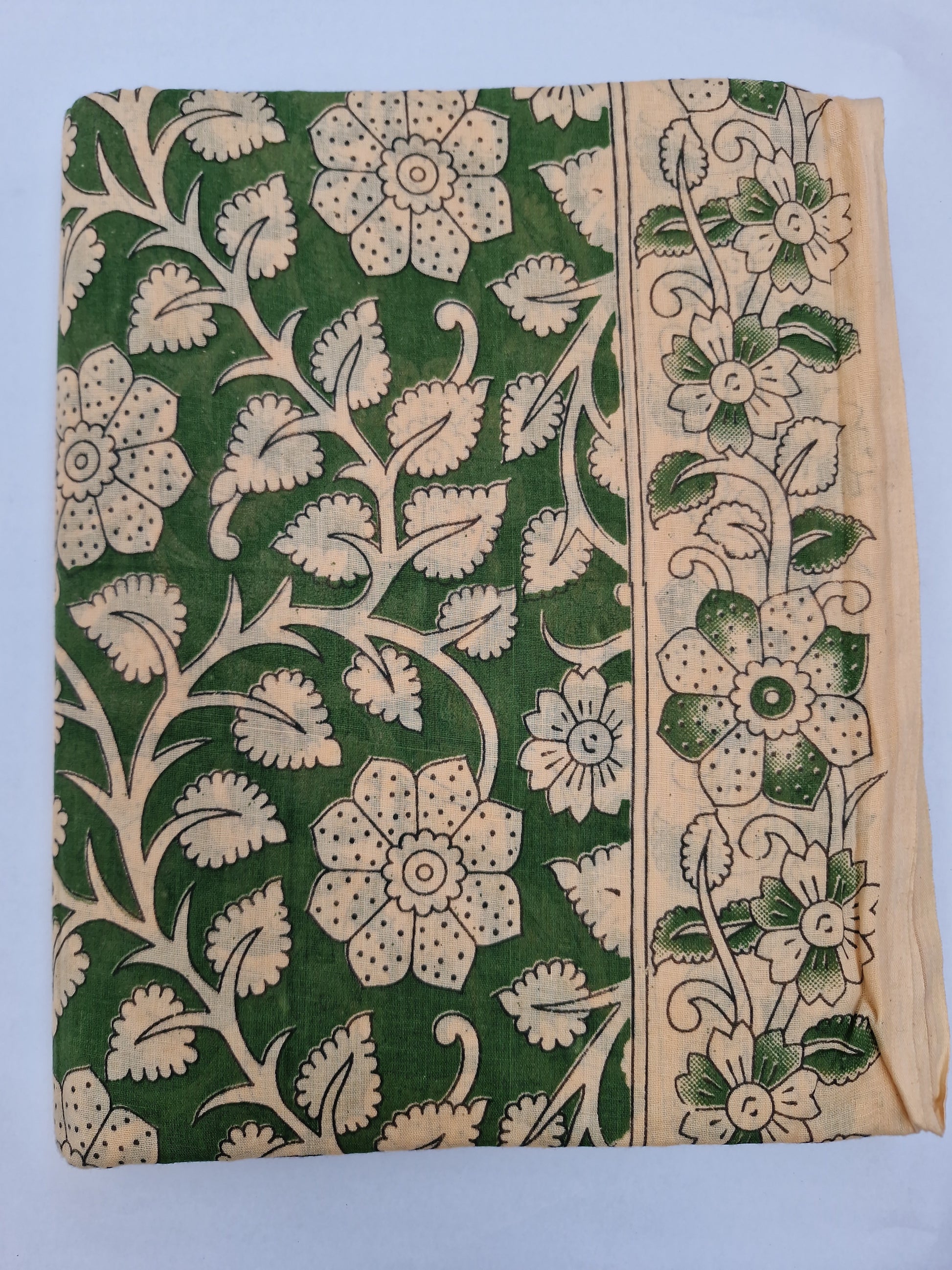 This exquisite green Kalamkari saree is a celebration of handcraft and tradition. The saree features a rich green base adorned with intricate floral motifs in natural shades, highlighted with detailed outlines that enhance its artistic appeal. The cream-beige contrast panel is beautifully decorated with paisley and vine patterns, reflecting the timeless charm of Kalamkari artistry.